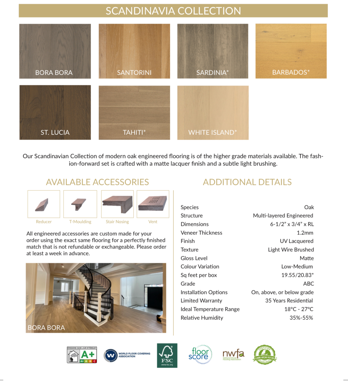 Our Scandinavian collection of modern oak engineered flooring is of the higher grades materials. The fashion-forward set is crafted with a matte lacquer finish and a subtle light brushing.