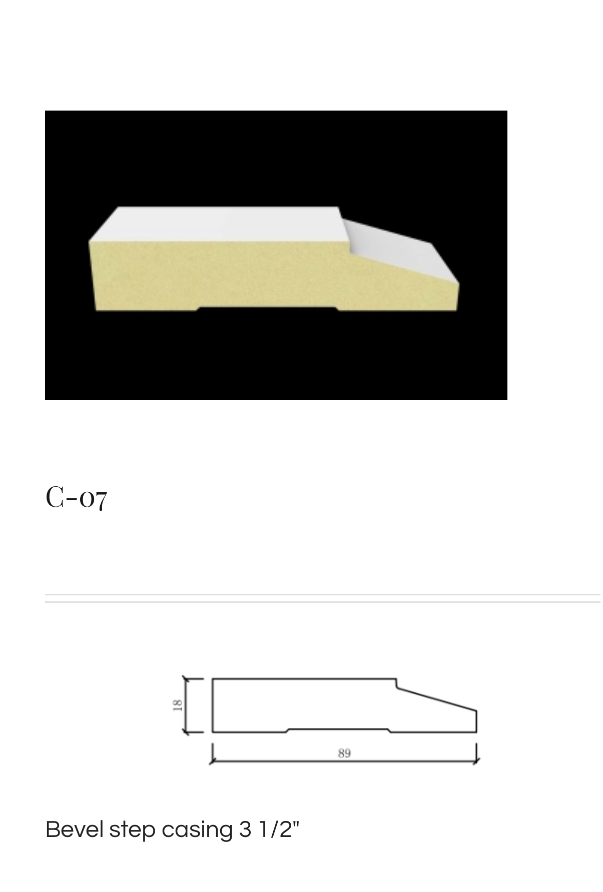 BackBevel step casing 3 1/2″ C-07$ 0.01/ eaAdd To Shopping Cart Add to WishlistCategoriesMoulding / Baseboard / TrimDetailsDimension mm(inch)3/4”*3 1/2”*8'SKU117