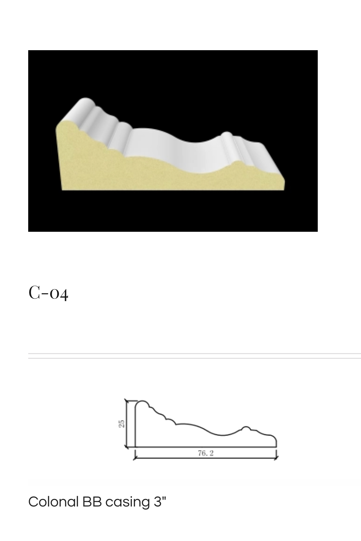 BackColonal BB casing 3″ C -04$ 0.01/ eaAdd To Shopping Cart Add to WishlistShareCategoriesMoulding / Baseboard / TrimDetailsDimension mm(inch)1”3”*8SKU120