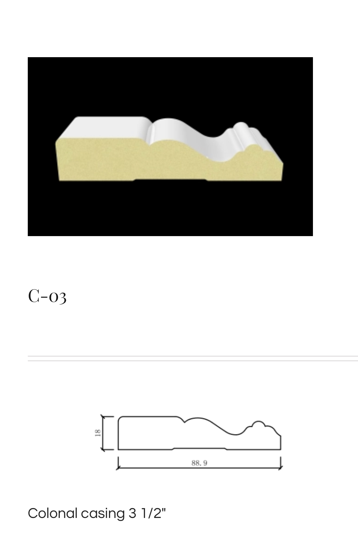 BackColonal casing 3 1/2″ C-03$ 0.01/ eaAdd To Shopping Cart Add to WishlistCategoriesMoulding / Baseboard / TrimDetailsDimension mm(inch)3/4*3 1/2*8”SKU121