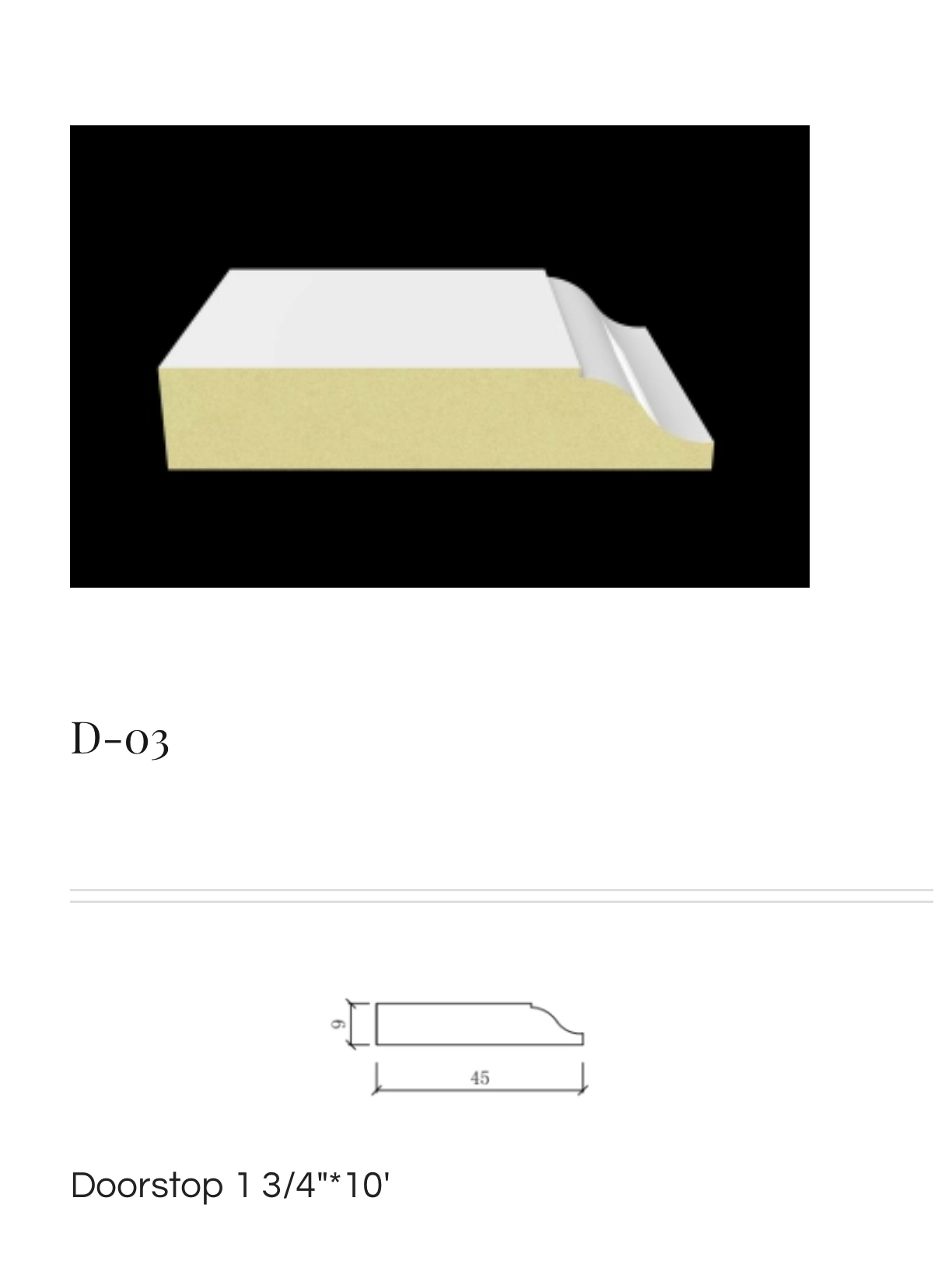 BackDoorstop 1 3/4″ D-03$ 0.01/ eaAdd To Shopping Cart Add to WishlistCategoriesMoulding / Baseboard / TrimDetailsDimension mm(inch)1/2*1 3/4*10SKU126